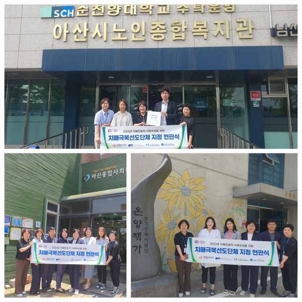 [충청뉴스큐] 아산시보건소 치매안심센터가 치매 친화적인 사회 문화 조성을 위해 아산시노인종합복지관, 아산종합사회복지관, 온양노인복지센터 3개 기관을 치매 극복 선도단체로 지정하고 지난달 31일 현판식을 진행했다.