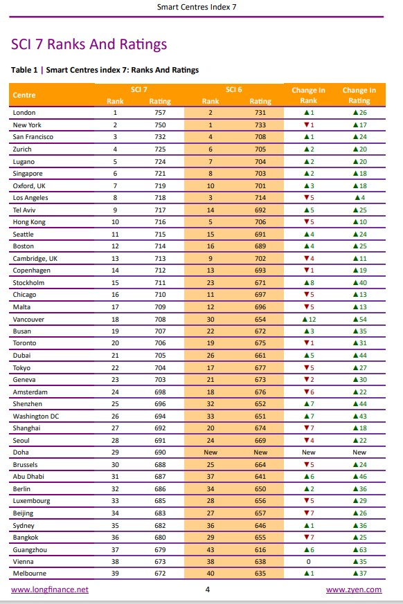 이번에 발표된 지수를 전체적으로 살펴보면, 세계 금융 중심지인 런던과 뉴욕이 각각 1위와 2위를 차지했고 샌프란시스코가 3위, 취리히가 4위로 뒤를 이었다.