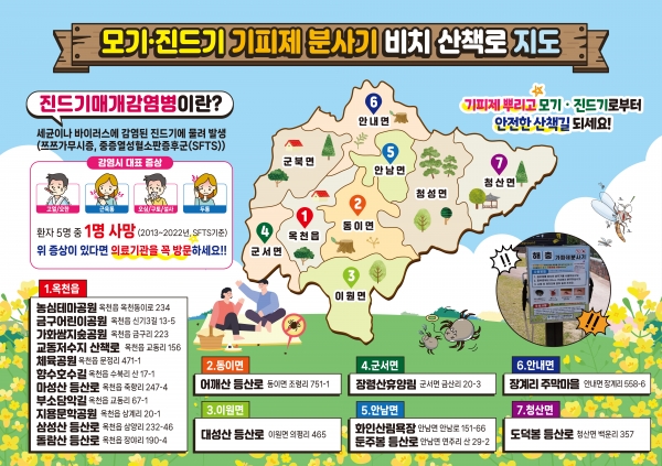 이에 군 보건소 또한 군민들의 진드기 매개 감염병 예방을 위해 등산로 산책길 등에 모기·진드기 기피제 분사기 18대를 설치·운영하고 있으며 군 농업기술센터와 연계해 농업인 대상으로 기피제 배부 및 예방 교육을 시행하고 있다.