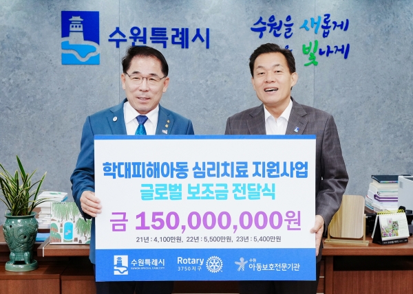 [충청뉴스큐] 국제로타리 3750지구가 수원시에 거주하는 학대피해아동의 심리치료 지원금으로 2021년 3월부터 세 차례에 걸쳐 총 1억 5000만원을 기부했다.