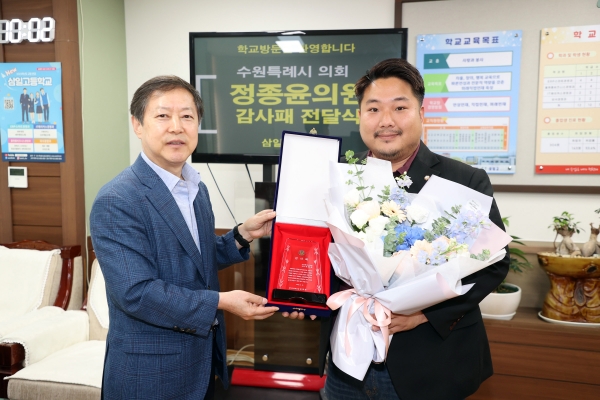 [충청뉴스큐] 수원특례시의회 정종윤 의원이 6. 5일 삼일고등학교에서 학교 측으로부터 감사패를 받았다.