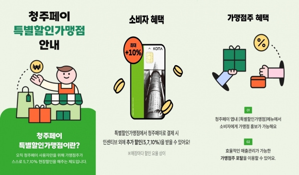 시는 지역 내 소상공인을 서비스 제공자로 참여시켜 청주페이 사용자와 소상공인이 상호 소통할 수 있는 환경을 조성하고 지역 내 소비를 촉진시키기 위해 특별할인가맹점을 도입했다.