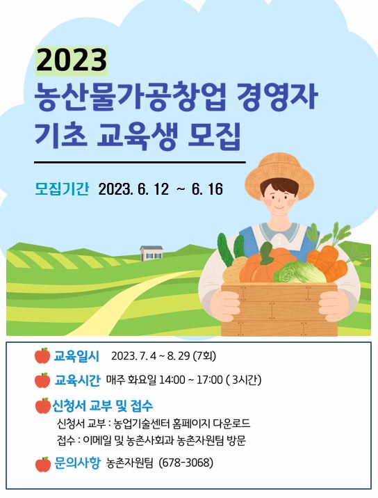 코로나 19로 비대면 줌으로 실시되었던 기초교육이 3년만에 대면 교육으로 진행되며 특히 이번 교육에서는 농산물가공 산업의 트렌드 및 시장전망, 가공식품 사업화 전략, 식품위생과 가공제품의 표시기준, 식품관련 법규 및 창업절차 등의 내용으로 식품환경연구센터 나혜진 대표 등 각 분야별 전문가를 모시고 진행된다.