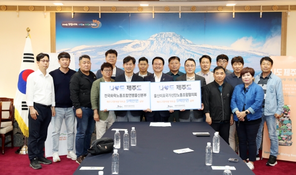 전국화학노동조합연맹 울산본부와 울산 미포국가산단 노동조합협의회는 8일 제주도청을 방문해“1년에 두세번은 사원 워크숍 등으로 제주를 꼭 방문하고 있어 마음의 고향인 제주에 기부금을 전달하기로 했다”며 “기회가 된다면 제주의 역사와 문화에 대한 교육을 받는 자리도 마련하면서 제주와 인연을 이어가고 싶다”고 전했다.