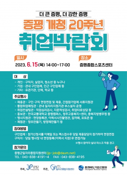 이재영 증평군수는 “ 군 개청 20주년을 맞이해 개최한 이번 취업박람회는 지난해 보다 참여 기업체수가 증가해 취업이 간절하고 절실한 구직자분들에게 적절한 일자리를 제공하고 기업에는 유능한 인재를 찾아줄 더없이 좋은 기회”며 “앞으로도 더 탄탄하고 내실 있는 일자리 정책을 강구해 군민들에게 행복한 일터를 제공하고자 한다”고 말했다.