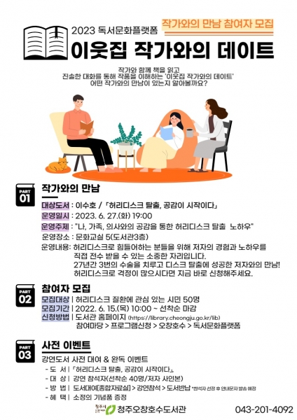 독서문화플랫폼 사업 일환으로 운영되는 ‘이웃집 작가와의 데이트’ 올해 첫 주자는 ‘허리디스크 탈출, 공감이 시작이다’의 저자 이수호 작가이다.