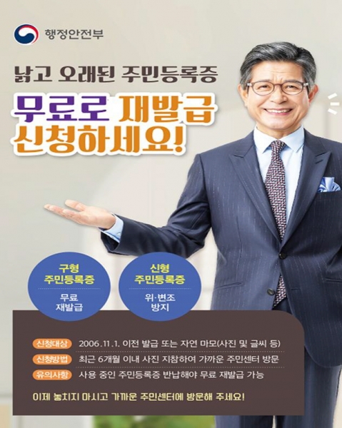 [충청뉴스큐] 아산시 읍면동 행정복지센터에 방문하면 사진, 글씨 등이 자연적으로 마모됐거나 2006년 11월 1일 이전에 발급돼 보안 기능 추가가 필요한 주민등록증을 무료로 재발급받을 수 있다.