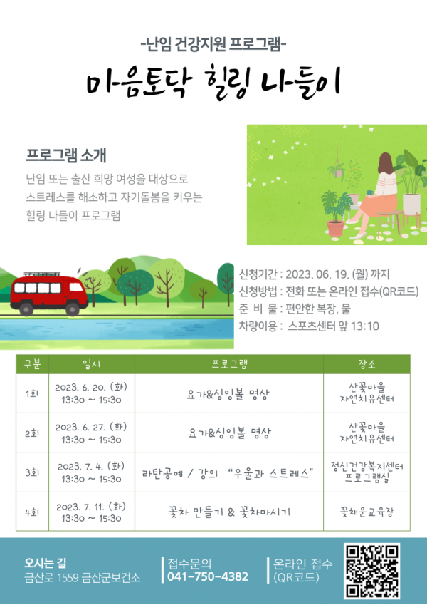[충청뉴스큐] 금산군보건소는 관내 난임 또는 임신 희망 여성을 대상으로 이달 20일부터 7월 11일까지 난임 건강지원 프로그램 ‘마음토닥 힐링 나들이’를 운영한다.