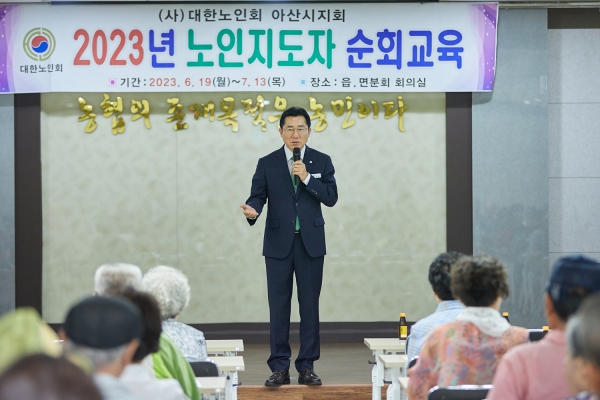 교육장을 찾은 박경귀 아산시장은 “어르신들을 밝은 모습으로 뵙게 돼 기쁘다”며 “어르신들을 위한 복지를 펼칠 수 있도록 늘 조언과 가르침을 주시는 오치석 대한노인회장님과 지역 지도자분들에게 감사드린다”고 인사말을 건넸다.