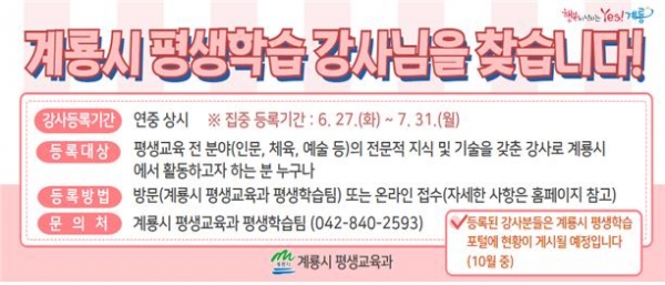 [충청뉴스큐] 계룡시가 지역사회의 유능한 강사를 발굴하고 효율적 연계를 위한 강사은행을 운영하고자 오는 27일부터 7월 31일까지 평생학습 강사 집중등록기간을 운영한다고 밝혔다.
