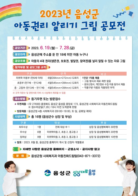 [충청뉴스큐] 음성군이 아동권리 인식 개선을 위해 2023년 아동권리 알리기 그림 공모전을 개최한다고 21일 밝혔다.