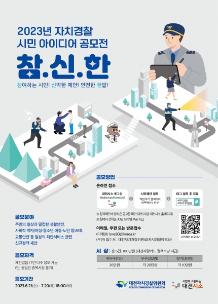 [충청뉴스큐] 대전자치경찰위원회가 시민의 의견을 반영한 치안정책을 발굴하기 위해 6월 21일부터 7월 20일까지 ‘23년 대전자치경찰 시민 아이디어 공모’를 실시한다고 밝혔다.