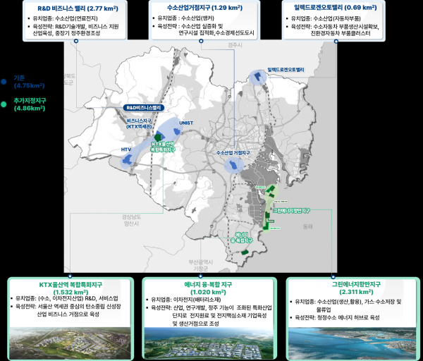 추가지정 지구별 유치업종을 보면, 케이티엑스 울산역 복합특화지구는 수소·이차산업 연구개발, 서비스업 등, 에너지 융·복합지구는 이차전지 등, 친환경에너지 항만지구는 수소산업, 가스, 수소저장 및 물류업 등으로 구성됐다.