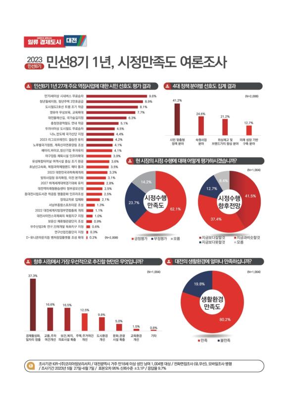 대전시는 시정 출범 1주년을 맞아 대전시민 만 18세 이상 성인 남녀 1004명을 대상으로 5월 27일부터 6월 7일까지 여론조사를 진행했다.