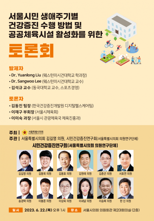 [충청뉴스큐] 서울시의회 도시안전건설위윈회 김길영 의원이 주관하는 ‘서울시민 생애주기별 건강증진 수행 방법 및 공공체육시설 활성화를 위한 토론회’가 22일 오후 1시 서울시의회 제2대회의실에서 개최된다.