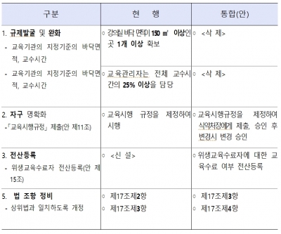 개정안의 주요 내용은 ,강의실 바닥 의무면적 삭제 ,교육관리자 의무 삭제 ,교육대상자 수료여부 전산등록 신설 ,상위법령 개정에 따른 법조항 변경 등이다.