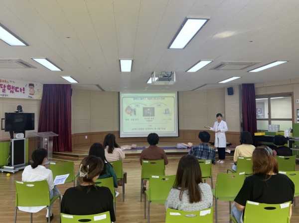 어울림놀이터에서 BLS 자격증을 소지한 보건교사가 심폐소생술을 통해 생존율을 높이고 뇌사로 인한 후유증을 감소시키기 위해 교직원을 대상으로 연수를 실시했다.
