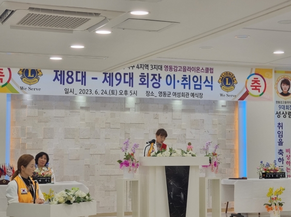 [충청뉴스큐] 영동감고을 라이온스클럽은 지난 24일 여성회관에서 정영철 영동군수를 비롯한 관내 기관·사회단체장, 주민 등 100여명이 참석한 가운데 회장 이·취임식을 가졌다.