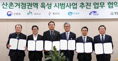 [충청뉴스큐] 산림청은 지난 7일 경북 예천군 국립산림치유원 산림치유문화센터에서 괴산군, 울진군, 인제군, 진안군, 평창군과 ‘산촌거점권역 육성 시범사업 추진을 위한 업무협약’을 체결했다.