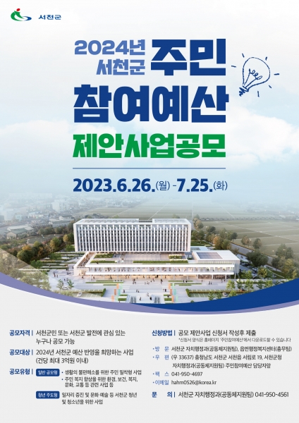 [충청뉴스큐] 서천군이 2024년 주민참여예산 편성을 위한 총 17억원 규모의 주민참여예산 제안사업 공모를 다음달 25일까지 실시한다고 27일 밝혔다.