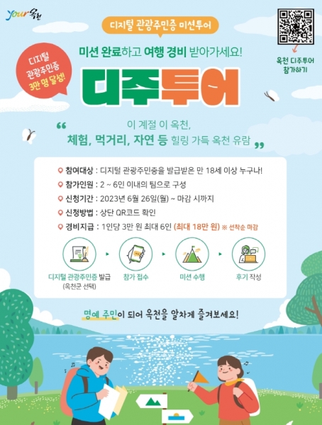 ‘디지털 관광주민증 투어’는 옥천군 디지털 관광주민증 발급자가 투어에 접수 및 참여해 지정된 미션을 수행하고 SNS에 후기를 업로드하면 팀당 최대 18만원의 경비를 받는 사업이다.