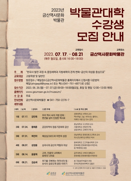 군 관계자는 “문화교육 공간으로써 금산역사문화박물관의 역할을 수행해 나가기 위해 이번 박물관대학이 추진된다”며 “우리 역사와 관련된 주제로 수준 높은 강의가 준비된 만큼 많은 관심을 당부드린다”고 말했다.