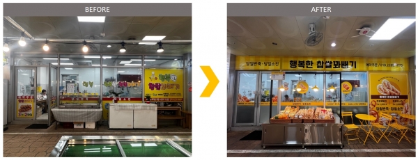 다양한 상품을 진열하는 시장의 특성을 반영해 상품별로 판매대를 구분하고 깔끔하게 진열했으며 효율적이고 편리한 점포 맞춤형 판매대 제작, 점포 간판 정비, 조명 설치뿐만 아니라 시장 전체가 밝고 깔끔한 이미지를 가질 수 있도록 개선했다.