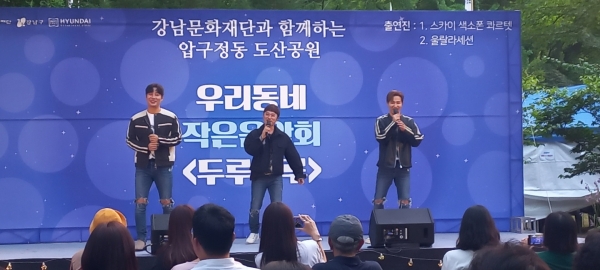 우리동네 작은음악회는 강남구와 강남문화재단 주관으로 궁마을공원, 율현공원 등에 이어 지역주민에게 일상 속 문화예술 향유 기회를 확대하고 강남 예술인 발굴과 육성을 위해 마련됐다.