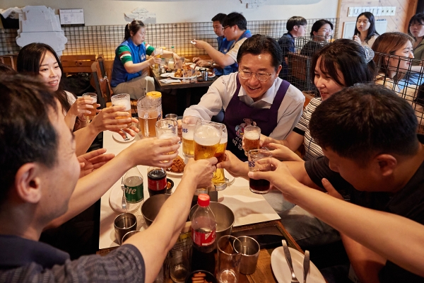 이날 박 시장은 앞치마를 착용한 후 테이블마다 손수 치킨과 맥주를 전달하며 MZ세대 공무원과 자유로운 소통의 시간을 가졌다.