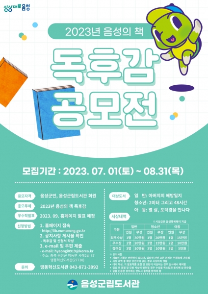 [충청뉴스큐] 음성군립도서관은 8월 31일까지 ‘2023년 음성의 책 독후감 공모전’을 개최한다고 3일 밝혔다.