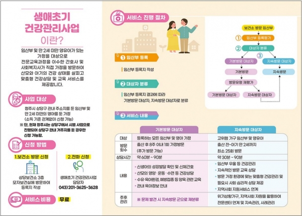 [충청뉴스큐] 청주시 상당보건소는 7월부터 상당보건소 등록 임산부와 만 2세 미만 영유아 가정을 대상으로 ‘생애초기 건강관리사업’을 운영한다고 밝혔다.