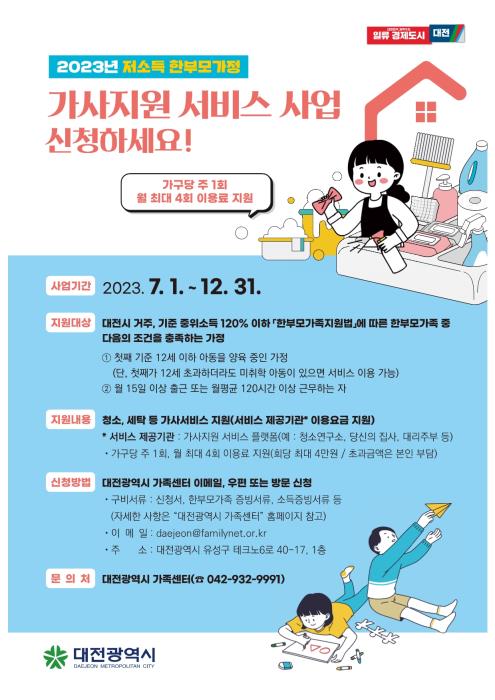 [충청뉴스큐] 대전시는 경제활동, 자녀양육 및 가사를 홀로 책임져야 하는 한부모의 가사 부담을 덜어주기 위해 7월부터 저소득 한부모가정 가사지원서비스 사업을 시행한다.
