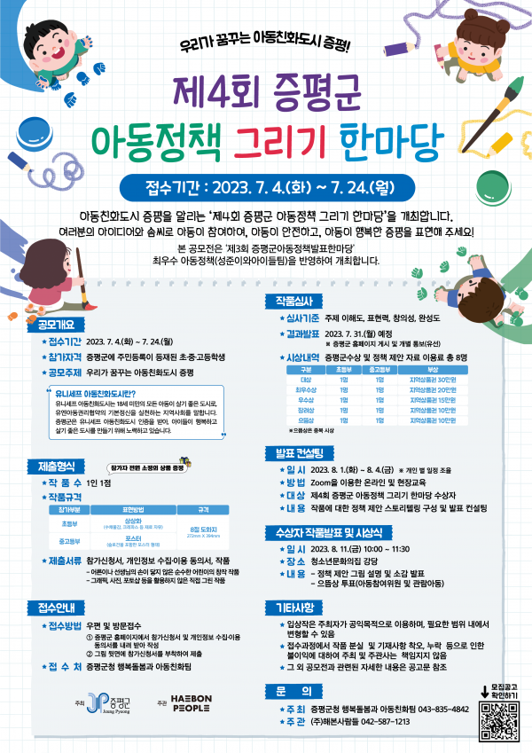 [충청뉴스큐] 아동친화도시 증평군이 제4회 증평군 아동정책 그리기 한마당을 위한 참가자를 7월 24일까지 모집한다.