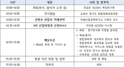 이어 이정훈 경기연구원 연구기획본부장이 좌장을 맡아 네오위즈 문지수 대표, 카이스트 박희경 부총장, 모두의 연구소 정지훈 박사, 워크앤올 김상혁 대표, 시지온 김미균 대표 등과 패널토론을 진행한다.