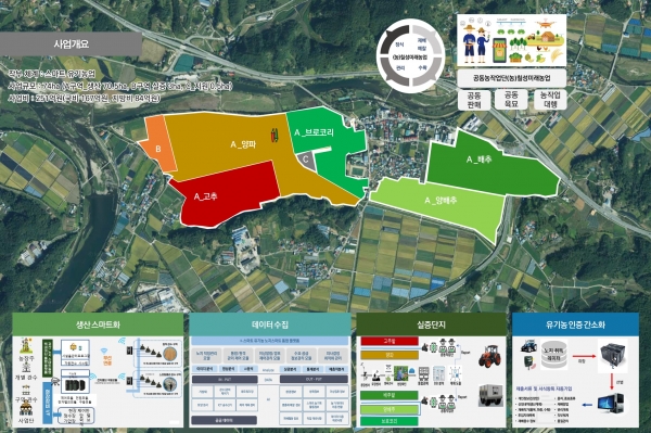 ‘K-스마트 유기농 혁신 시범단지 조성사업’은 고령화에 따른 일손 부족과 낮은 기계화율, 경험에 의한 관행농업을 스마트 유기농업으로 전환하는 사업으로 데이터를 기반으로 작물의 생산량 예측, 병해충 예방, 농가 인력·경영비 절감 등을 도모해 미래 농업을 선도하는 유기농 스마트농업 단지를 조성하는 사업이다.