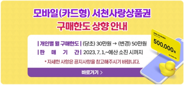 [충청뉴스큐] 서천군이 7월부터 모바일 서천사랑상품권의 월 구매 한도를 기존 30만원에서 50만원으로 상향한다고 밝혔다.