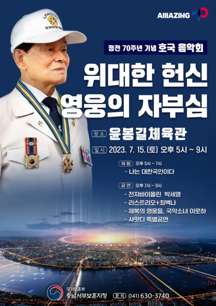 [충청뉴스큐] 예산군은 6·25전쟁 정전 70주년을 맞아 ‘위대한 헌신, 영웅의 자부심’을 주제로 7월 15일 오후 5시부터 윤봉길체육관에서 호국음악회를 개최한다고 밝혔다.