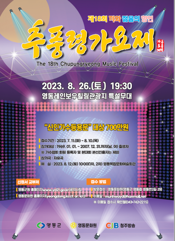 [충청뉴스큐] 충북 영동군이 제18회 추풍령가요제 참가신청을 다음달 10일까지 받는다.