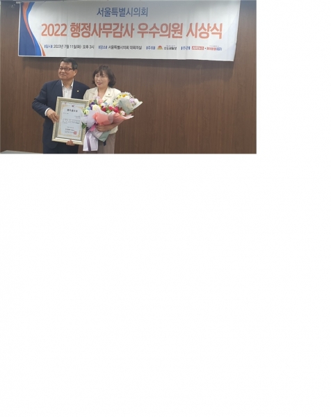 [충청뉴스큐] 심미경 서울시의회 의원이 11일 서울시의회 제2대회의실에서 열린 수도권일보가 주최하고 시사뉴스 및 파이낸셜데일리가 공동주관한 ‘2022 행정사무감사 우수의원 시상식’에서 우수의원으로 선정되어 수상했다.