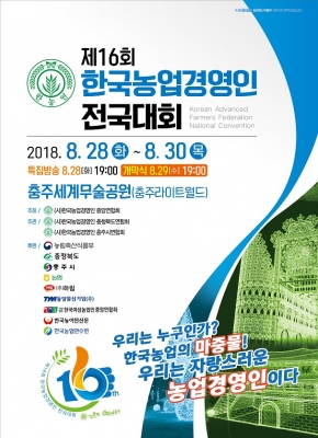 [충청뉴스Q] 제16회 한국농업경영인 전국대회가 ‘한국농업의 마중물, 우리는 자랑스러운 농업경영인이다!’를 주제로 오는 28일부터 3일간 충주 세계무술공원 일원에서 개최된다.
