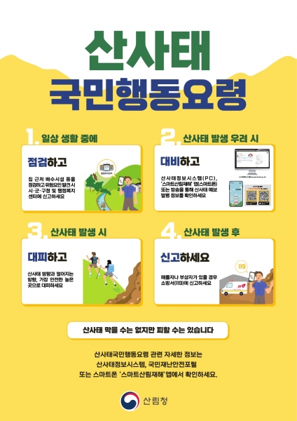 한편 국지성 집중 호우나 태풍 북상 시 기상 예보에 주의를 기울여 상황전파에 예의 주시하고 산지 하단 거주 주민은 주변 토양에서 용출 현상 등 산사태 전조 현상이 있을 시 해당 읍·면이나 산림녹지과에 즉시 연락 후 신속히 인근 경로당 및 마을 회관 등 대피장소로 미리 이동해야 한다.