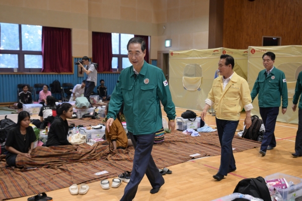 한 총리는 “예상을 뛰어넘는 호우로 국민들이 많은 어려움을 겪고 있다”며 “대피해 계신 주민들이 불편함을 겪는 일이 없도록 생필품 등을 충분히 지원하고 민간 구호단체와도 적극 협조해달라”고 말했다.