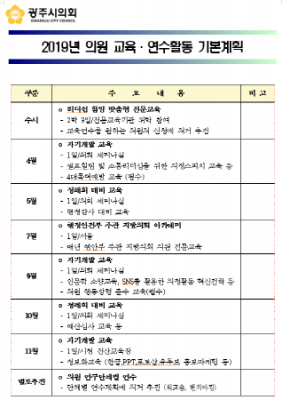 [충청뉴스큐] 광주시의회는 의정활동 전반에 필요한 전문지식과 능력을 배양하고 효율적인 의정활동을 수행하기 위한 맞춤형 역량개발을 위해 ‘2019년 광주시의회 교육훈련 기본계획’을 수립했다.