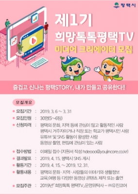 제1기 평택시 미디어크리에이터는 시의 공식 소셜 방송국 ‘희망톡톡 평택TV’에 소속되어 전문적인 영상 교육과 제작 지원을 통해 평택시의 문화·지역·사람들의 이야기, 교육, 여행 등 다양한 콘텐츠 제작 또는 출연하며 시민과의 소통에 중추적 역할을 담당하게 된다.