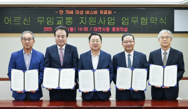 [충청뉴스큐] 대전시는 17일 하나은행, 하나카드, 버스운송사업조합, 티머니와 ‘만 70세 이상 어르신 무임교통 지원사업을 위한 업무협약’을 체결했다.