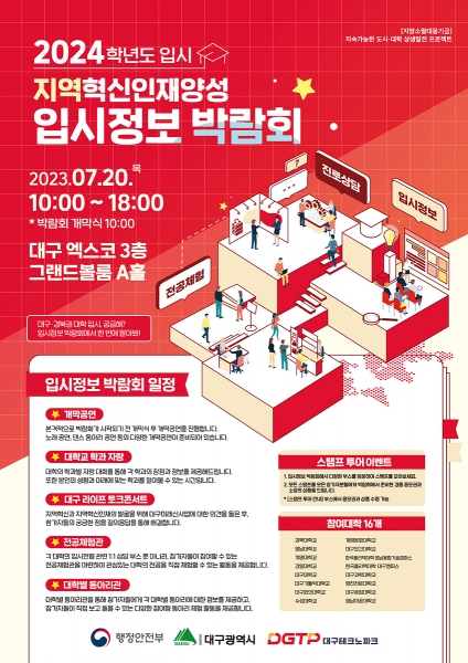 [충청뉴스큐] 대구광역시는 지역대학의 입시정보를 한자리에서 제공하고 우수인재의 지역대학 정착을 유도하고자 ‘지역혁신 인재양성 입시정보 박람회’를 7월 20일 오전 10시부터 오후 6시까지 대구 EXCO에서 개최한다.