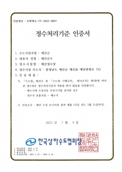 예산정수장은 2022년 2월 25일에 정수처리기준 최초 인증을 받아, 이번 2023년 7월 4일에 정수처리기준 인증서를 획득했다.