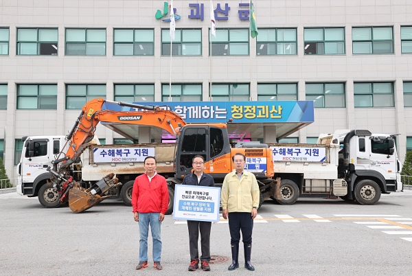 [충청뉴스큐] HDC현대산업개발은 지난 19일 괴산군을 방문해 재해복구를 위한 생필품 및 복구장비 지원 기탁식을 가졌다.