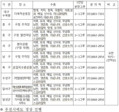 기관별 분양 내역은 대구수목원의 경우 수목원 운동장에서 헛개, 치자, 무환자 등 12종의 묘목 5,400그루를 1인당 2~3그루씩 나눠 주며,