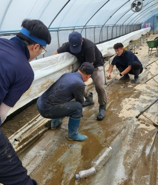 4-H청년농업인들은 쓰러진 딸기 배드시설 및 흘러내린 토사 정리 등에 힘을 쏟았다.